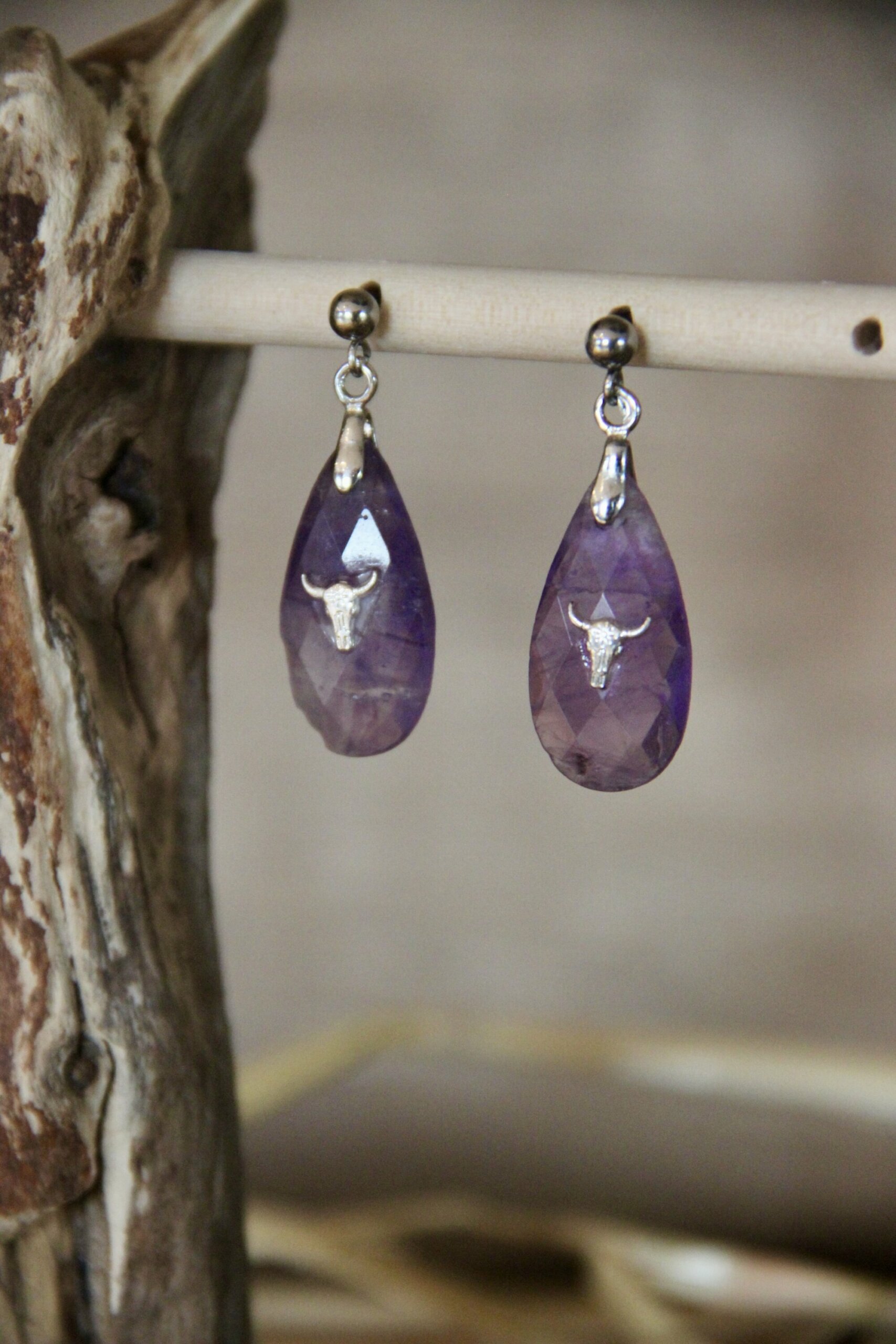 Boucles d’oreilles en pierres semi-précieuses : Pierre naturelle d’améthyste Monture en Acier Inoxydable Pendentifs goutte taureau en améthyste Assemblée a la main